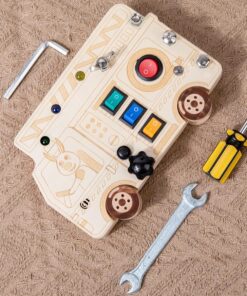 Mod de utilizare: Copilul poate folosi uneltele incluse pentru a strânge sau slăbi șuruburile, să rotească butoanele, să apese întrerupătoarele și să observe reacțiile. Este un exercițiu practic perfect pentru copiii pasionați de scule și „meșterit”, dar și o introducere distractivă în lumea mecanicii și electricității simple.