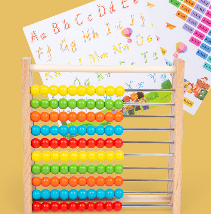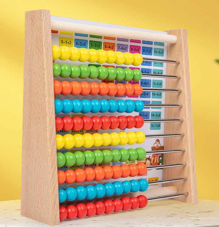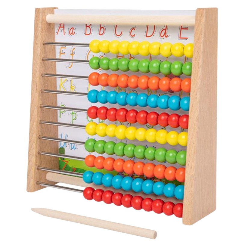 Abacul este prevăzut cu bile colorate în roșu, galben, verde, albastru și portocaliu, care sunt dispuse pe tije metalice. Fiecare tijă are câte 10 bile, iar copilul poate muta bilele dintr-o parte în alta pentru a învăța să numere, să adune și să scadă. De asemenea, pe spatele abacului sunt prezente tabele cu litere și tabele de înmulțire, oferind astfel posibilitatea de a învăța alfabetul și operațiile matematice de bază într-un mod vizual și interactiv.