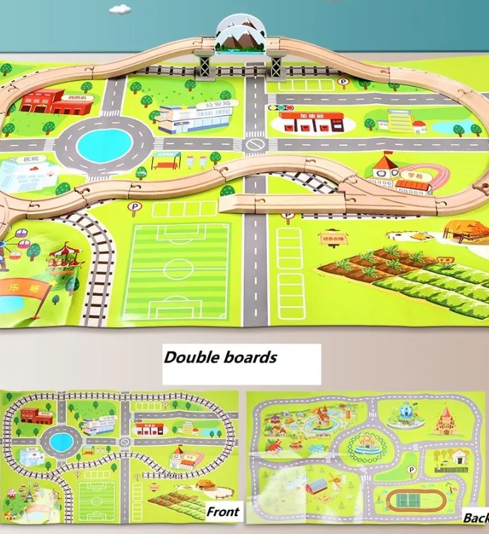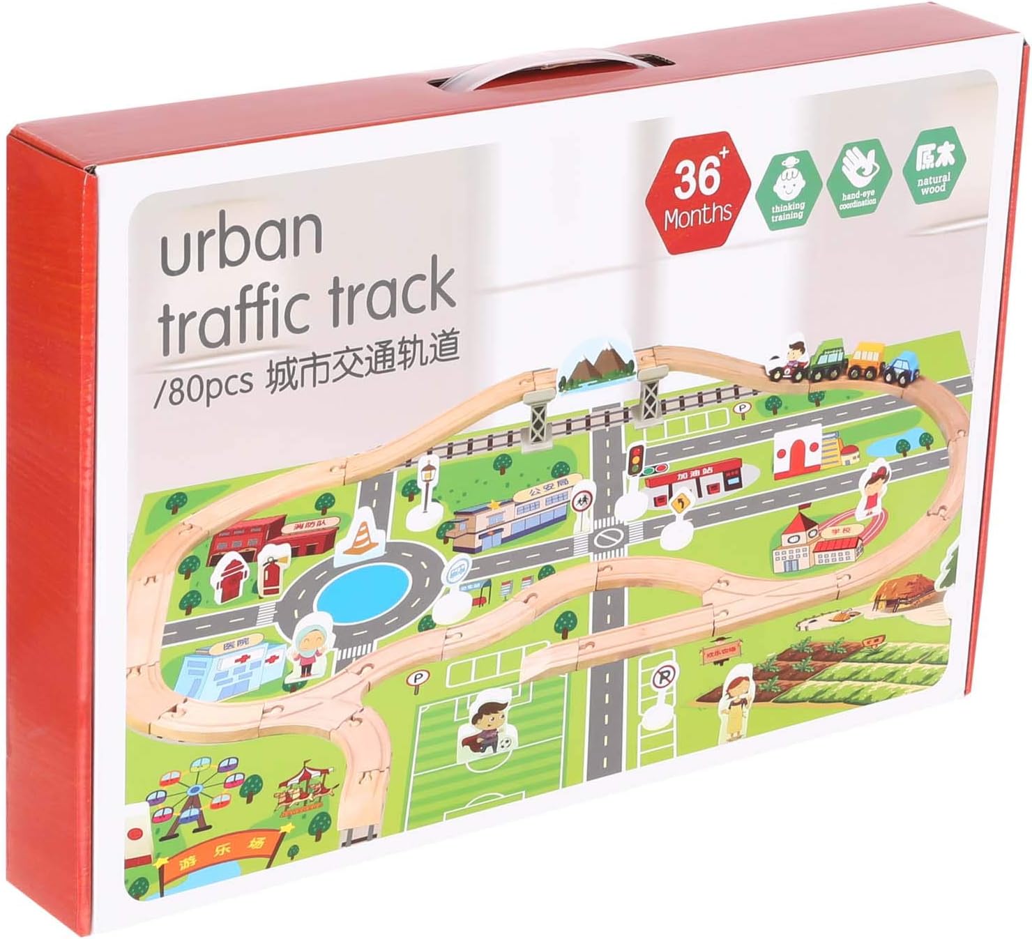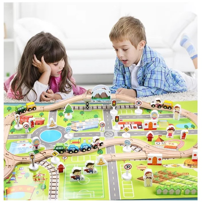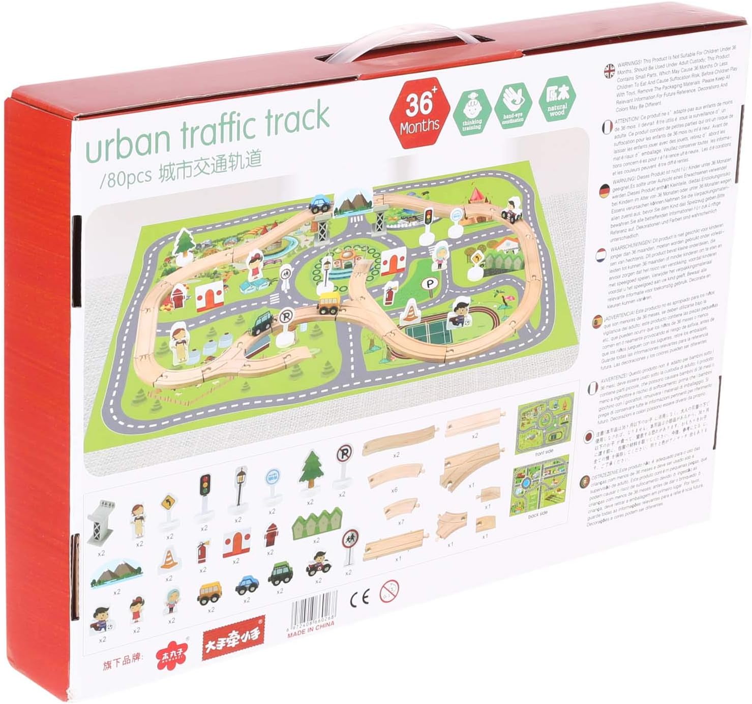 Orasel cu circuit auto si feroviar din lemn, cu 80 de piese, 3 ANI