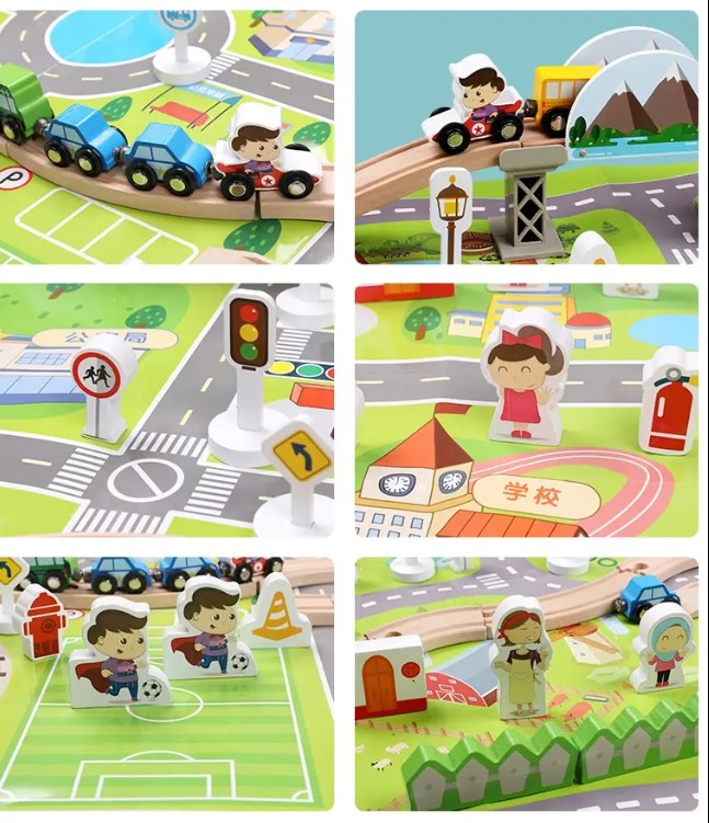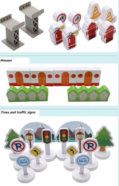 Conține vehicule feroviare și auto, semne de circulație, copaci, clădiri, personaje și accesorii tematice care conturează un peisaj urban plin de viață.
