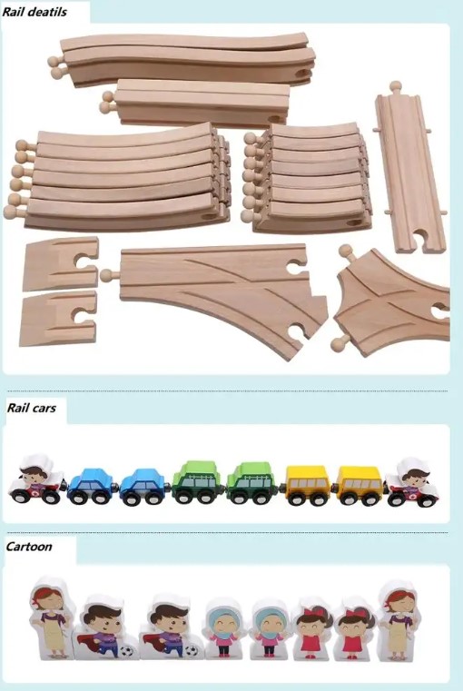 Include șine de tren din lemn care pot fi combinate în multiple variante de traseu.