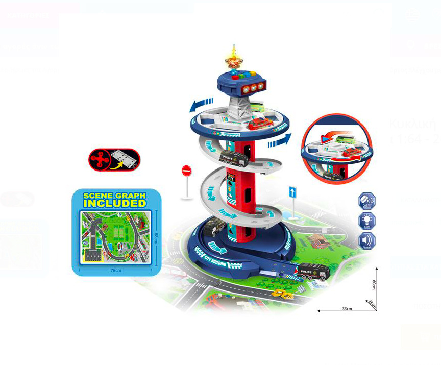 Garaj auto cu pistă circulară cu 3 etaje, covoraș cu detalii de spațiu 78×58 cm, semne de circulație și 3 mașini împreună.
