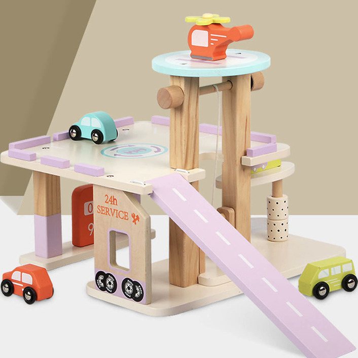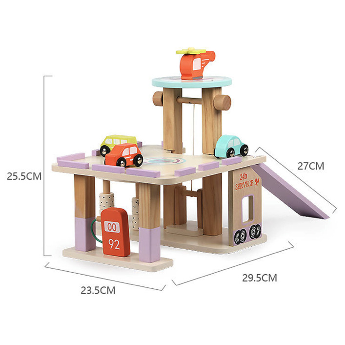 Parcare supraetajata pe 2 nivele, cu masinute si elicopter, din lemn, 26 cm, 3 ani+