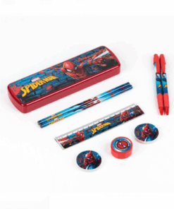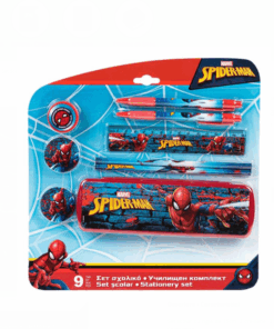 Setul contine: rigla de 15cm, 2 creioane, 2 pixuri, 1 ascutitoare, 2 radiere si 1 penar dreptunghiular din plastic (19.5x2x6cm) cu model Spiderman.