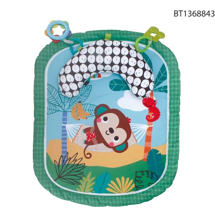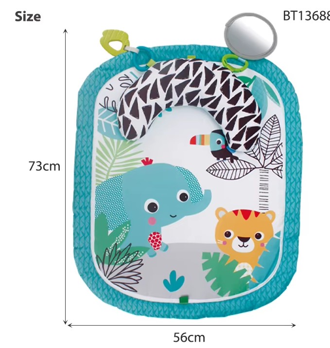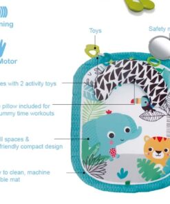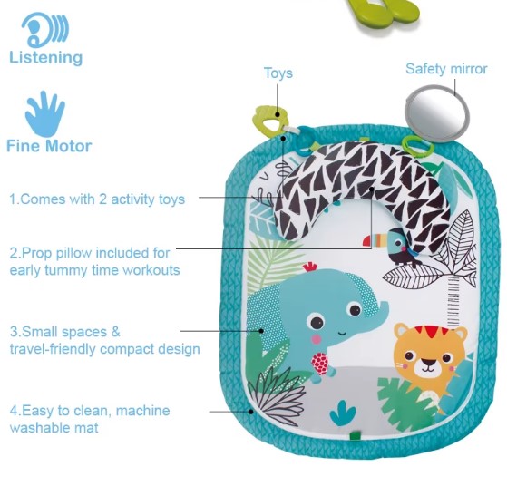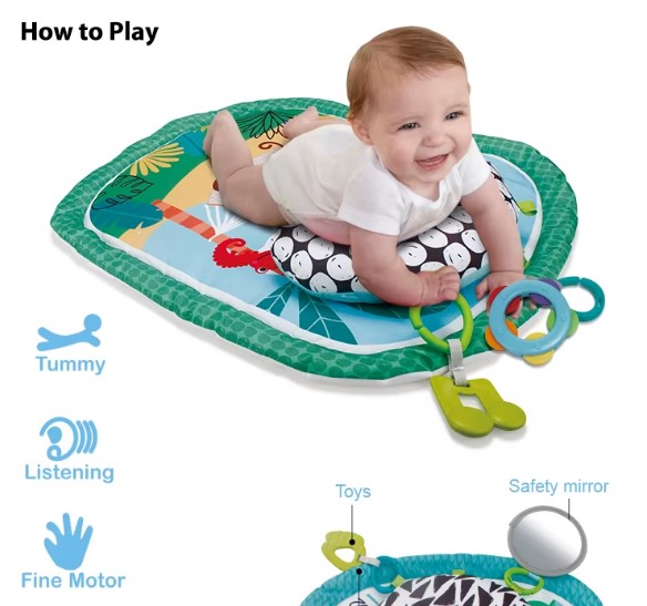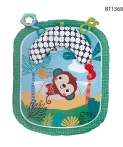 Salteluța tematică, cu ilustrații colorate inspirate din natură (elefant, tigru, maimuță, plante tropicale), captează atenția bebelușului și stimulează interesul vizual. Perna semicirculară oferă susținere optimă pentru piept și brațe, ajutând copilul să își ridice capul mai ușor și să își întărească musculatura gâtului și a spatelui.