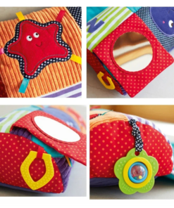 Texturile diferite (catifea reiată, material moale, suprafețe cu puncte) stimulează simțul tactil, iar culorile contrastante contribuie la dezvoltarea percepției vizuale în primele luni de viață.