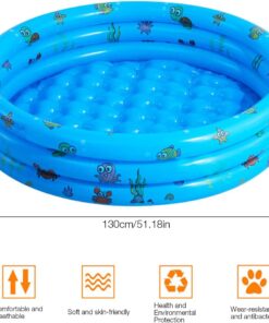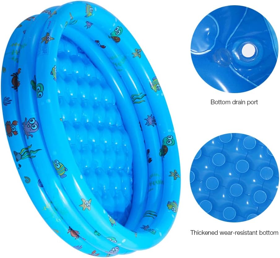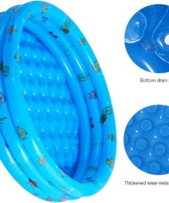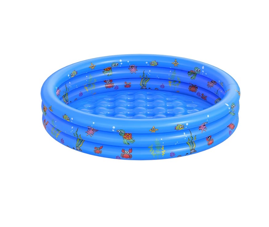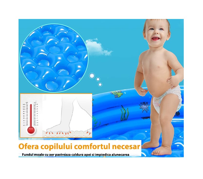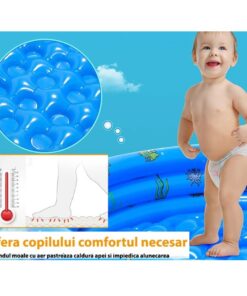 Piscină gonflabilă pentru copii, cu diametru generos de 150 cm și înălțime de 35 cm, ideală pentru joacă în aer liber în zilele călduroase. Model viu colorat, compus din 3 inele gonflabile rezistente, decorate cu animale marine simpatice. Fundul piscinei este moale, umplut cu aer, pentru un plus de confort și siguranță în utilizare.