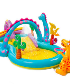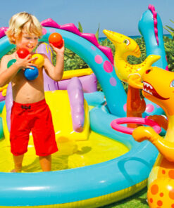 !Incluse in pachet sunt 5 mingi, un sistem de pulverizare a apei, o serie de reprezentari de animale preistorice gonflabile, 3 inele gonflabile,