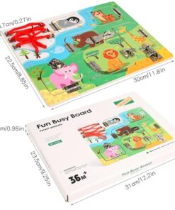 Placa este confecționată din lemn de calitate, cu margini rotunjite și vopsele non-toxice pe bază de apă, fiind sigură pentru utilizarea zilnică. Fiecare fereastră ascunde imagini colorate cu animale simpatice din pădure, stimulând curiozitatea și imaginația copilului.