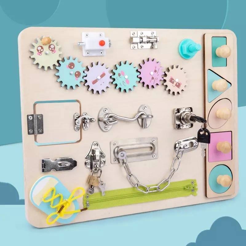Placa senzoriala bebelusi cu activitati Montessori – Busy Board