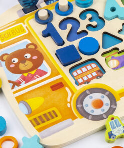 Puzzle multifuncțional din lemn, format dintr-o placă de joc sub formă de autobuz școlar, cu 6 tipuri de activități integrate: