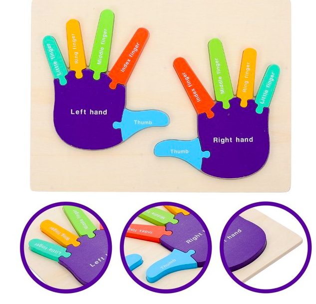 Puzzle-ul din lemn, de tip Montessori ajuta la dezvoltarea abilitatii motrice, si invatarea notiunilor de mana drepta, mana stanga. Un puzzle din lemn cu piese groase, reprezinta doua maini cu degete. Joc in limba engleza.