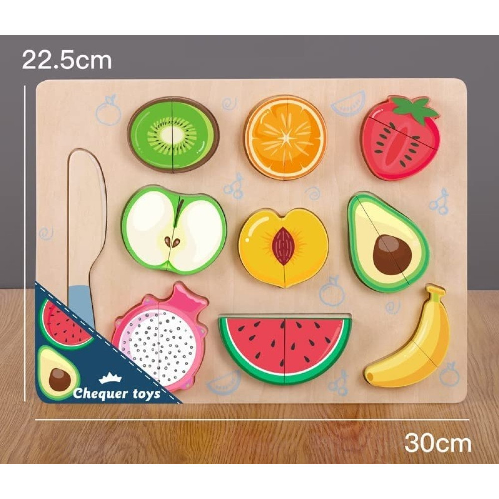 - Numar piese: 9 fructe a cate 2 piese, un cutit si placa suport din lemn.