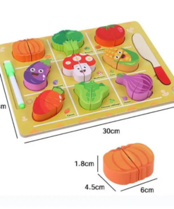 Acest puzzle educativ din lemn combină două activități preferate de cei mici — jocul de asociere și jocul de rol de bucătărie. Copiii pot învăța să recunoască legumele, să le „felieze” cu cuțitul din lemn inclus și să exerseze primele scrieri pe tăblița magnetică. Este o jucărie completă, care stimulează imaginația, motricitatea și curiozitatea pentru alimentația sănătoasă.