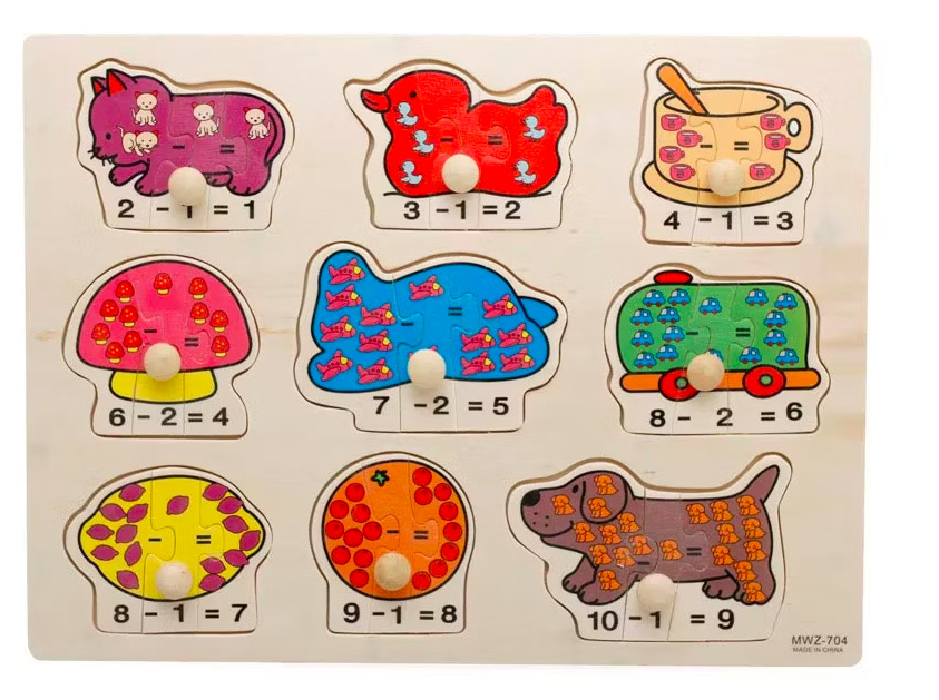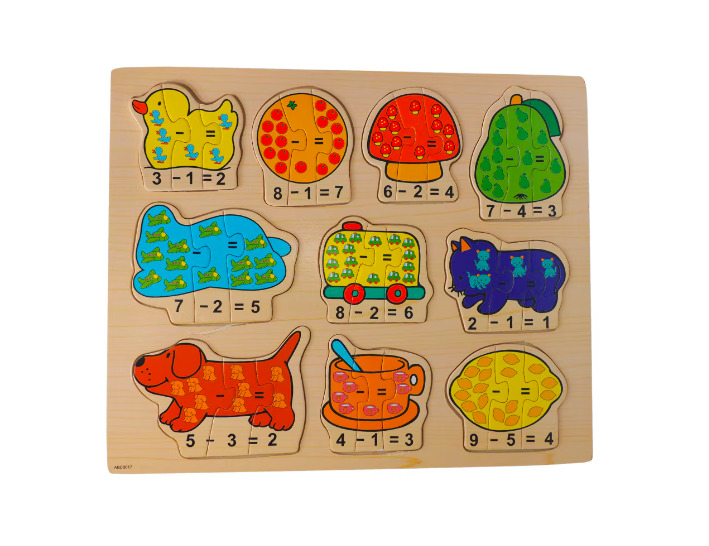 Ajută-l pe copilul tău să învețe operațiunile de scădere într-un mod interactiv și distractiv cu acest puzzle educativ din lemn. Perfect pentru copiii de peste 3 ani, puzzle-ul promovează gândirea logică, dezvoltarea cognitivă și abilitățile motrice fine.
