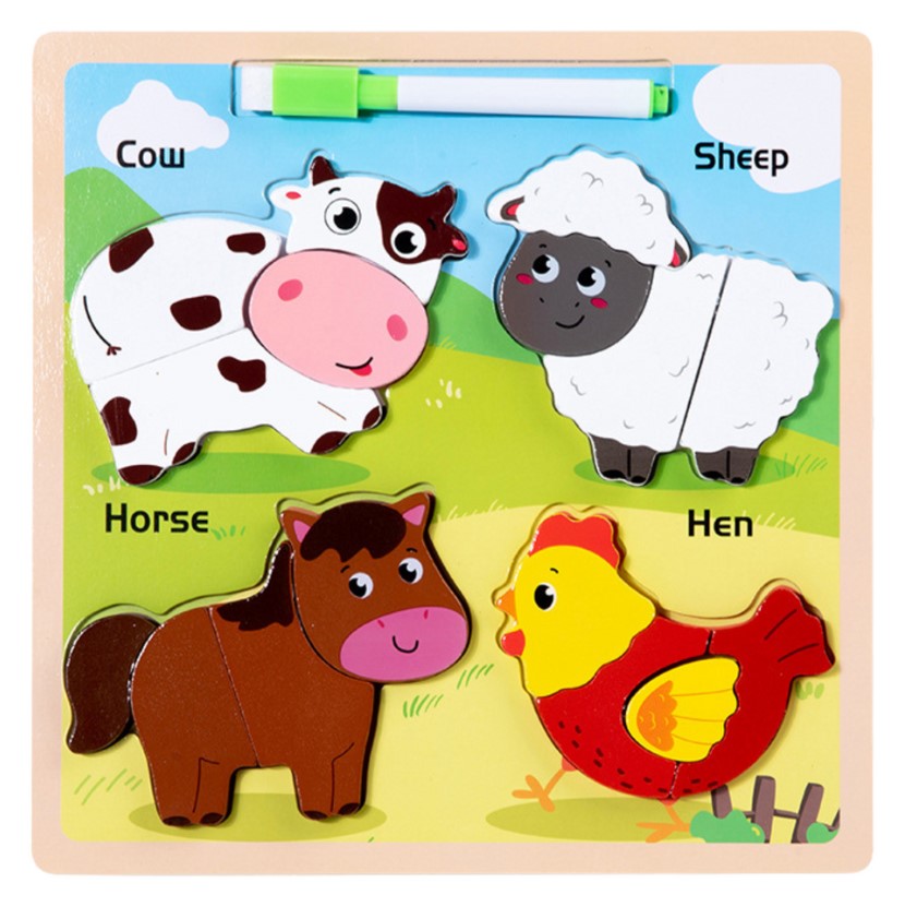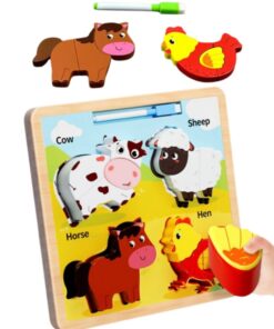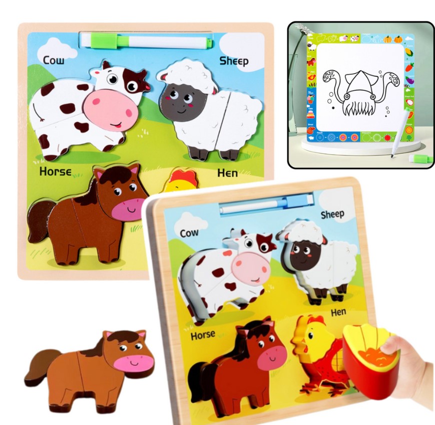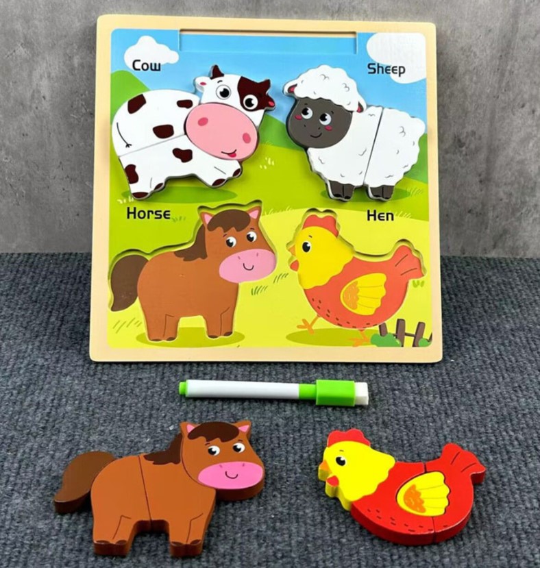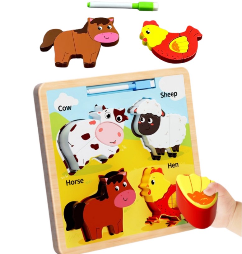 Acest puzzle educativ din lemn este special conceput pentru copiii mici, începând cu vârsta de 2 ani, și oferă o experiență de joacă dublă: învățare prin potrivirea pieselor și exprimare creativă prin desen. Tabla conține patru animale domestice îndrăgite – vaca, oaia, calul și găina – fiecare reprezentat prin piese groase, ușor de prins de mânuțele mici. Fiecare animal este format din 2 piese mari, ilustrate atractiv, care dezvoltă gândirea logică, motricitatea fină și coordonarea mână-ochi.