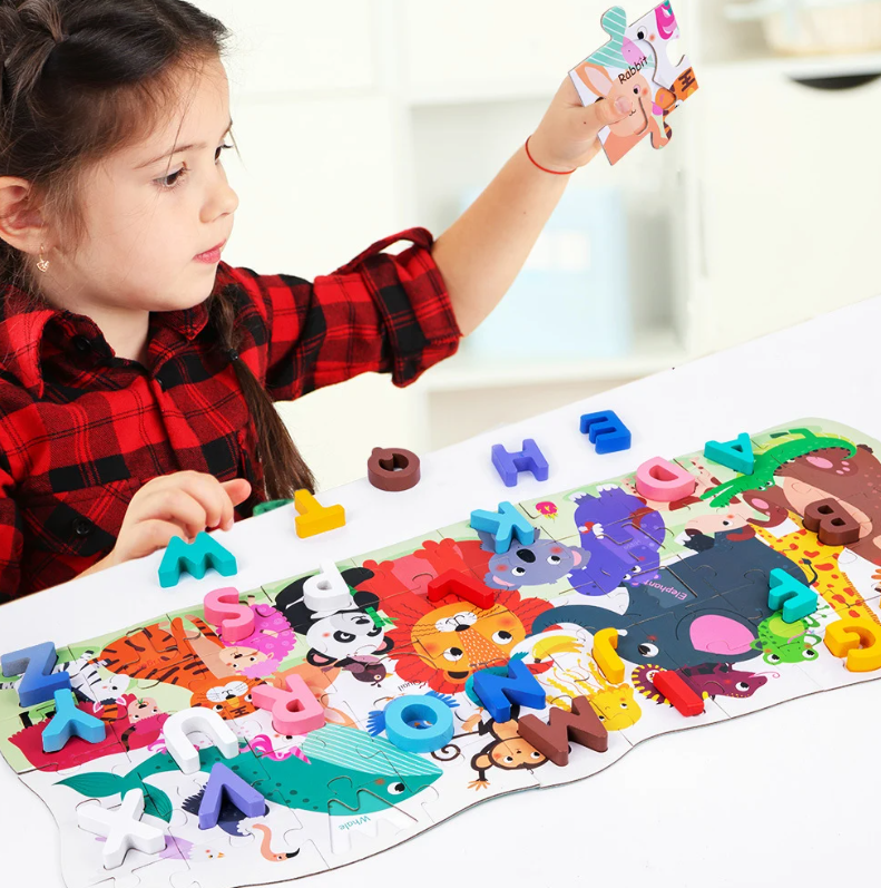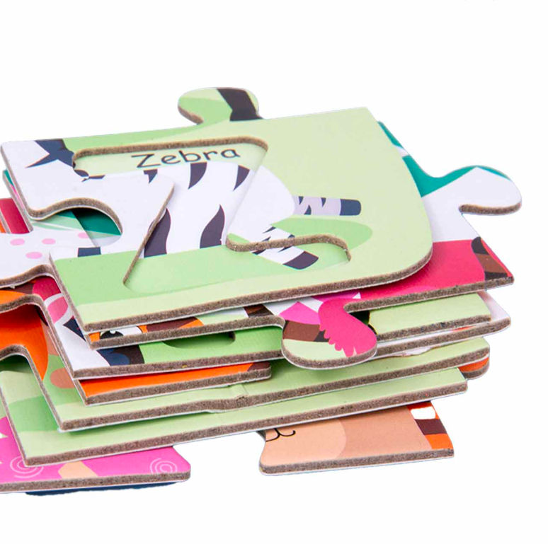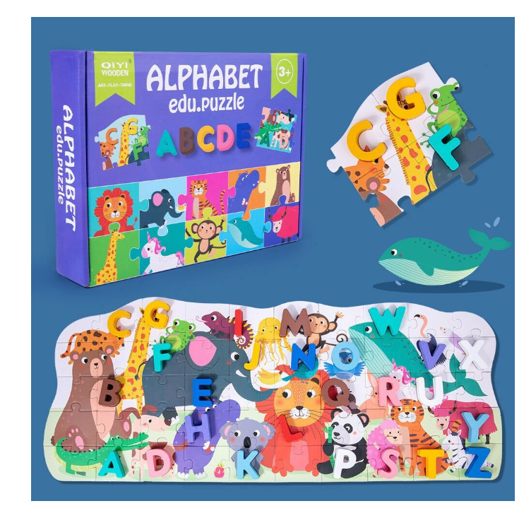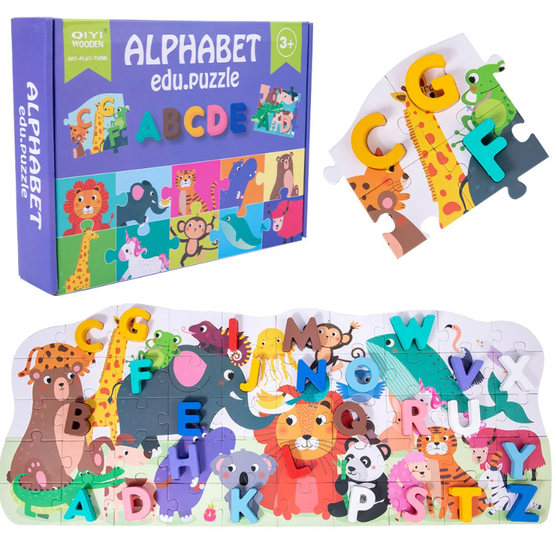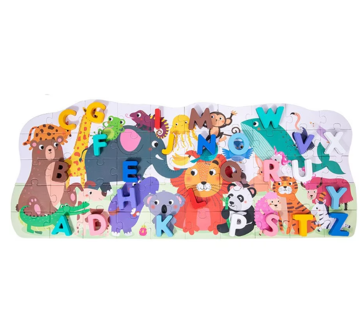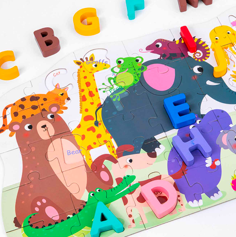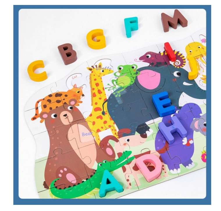 - Design atractiv și educativ: Puzzle-ul include ilustrații viu colorate cu animale simpatice, fiecare asociat cu o literă din alfabet. Numele fiecărui animal este scris în limba engleză, ajutând copilul să asocieze cuvinte cu literele corespunzătoare.