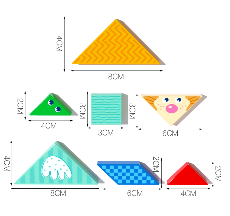 Acest puzzle tip Tangram este ideal pentru micuții exploratori ai formelor și culorilor! Setul educativ conține 21 de piese geometrice de diverse culori și dimensiuni, concepute pentru a stimula creativitatea și gândirea logică a celor mici. Copiii pot folosi piesele pentru a recrea imagini din sabloanele ilustrate sau pentru a inventa propriile forme, dezvoltând astfel abilități de recunoaștere a formelor, coordonare mână-ochi și răbdare.