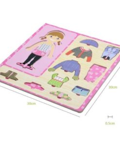 Un puzzle educativ din lemn pe care se gaseste desenat un contur, in decupajul caruia se pot potrivi piese vestimentare alaturate.