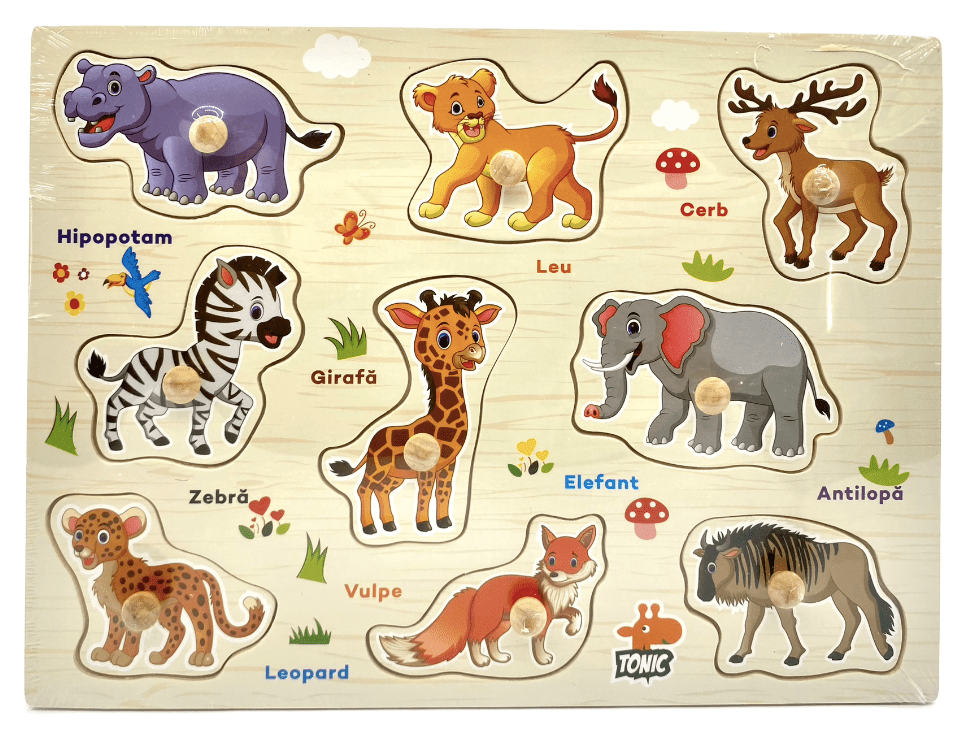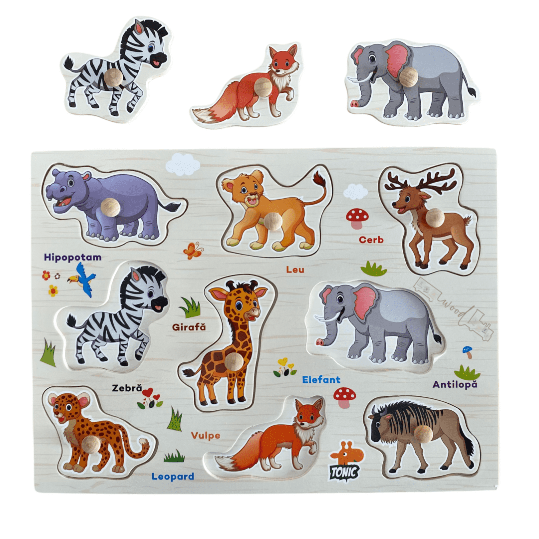 Puzzle Incastru din lemn in limba romana, Animale Salbatice