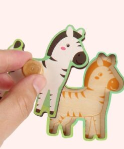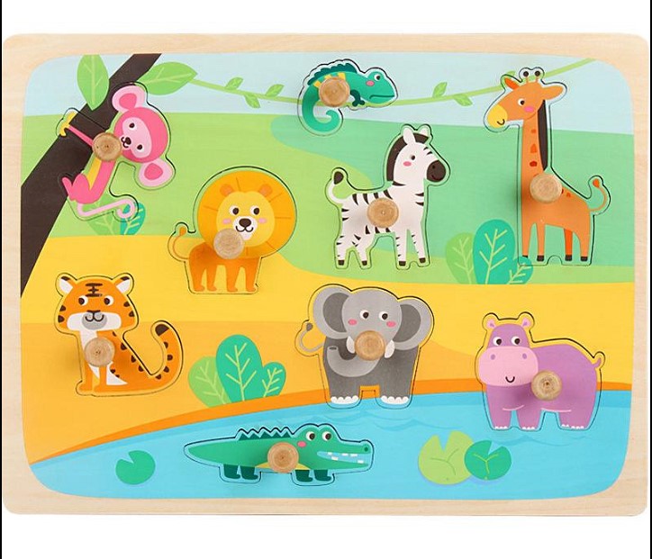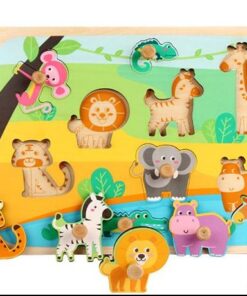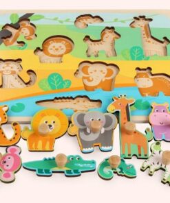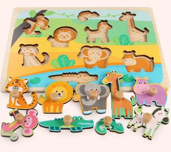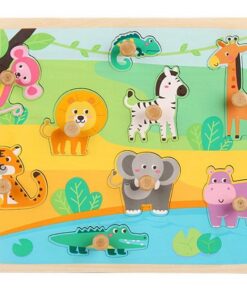Acest puzzle încastru din lemn cu butoni este perfect pentru a introduce copiii în fascinanta lume a animalelor sălbatice. Fiecare piesă este ilustrată cu un animal prietenos din savană sau junglă, precum leu, elefant, girafă, tigru, maimuță, crocodil și altele. Fiecare formă se potrivește într-un spațiu conturat și este dotată cu un buton din lemn, special conceput pentru mâinile mici ale copiilor.