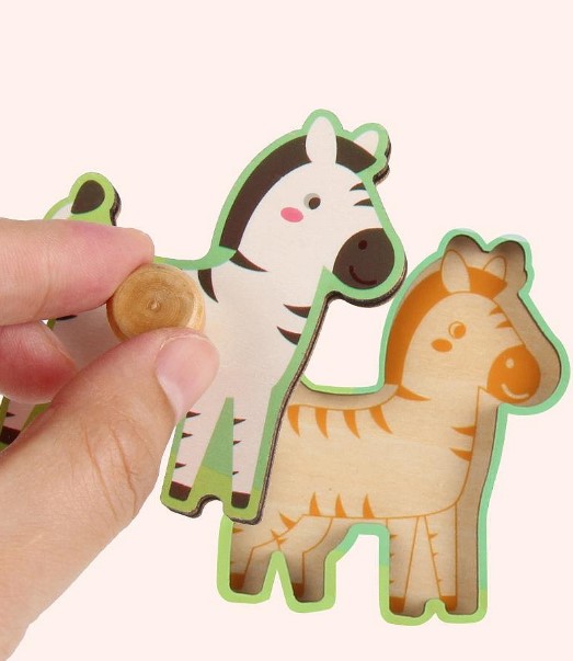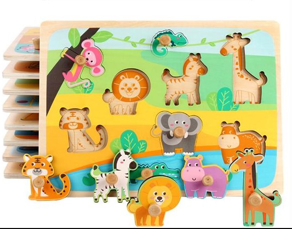 Puzzle încastru din lemn cu butoni – Tematică Animale sălbatice, 3 ani+