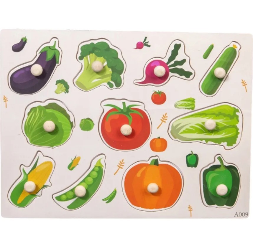 Puzzle incastru din lemn cu butoni si imagine de asociere, Legume