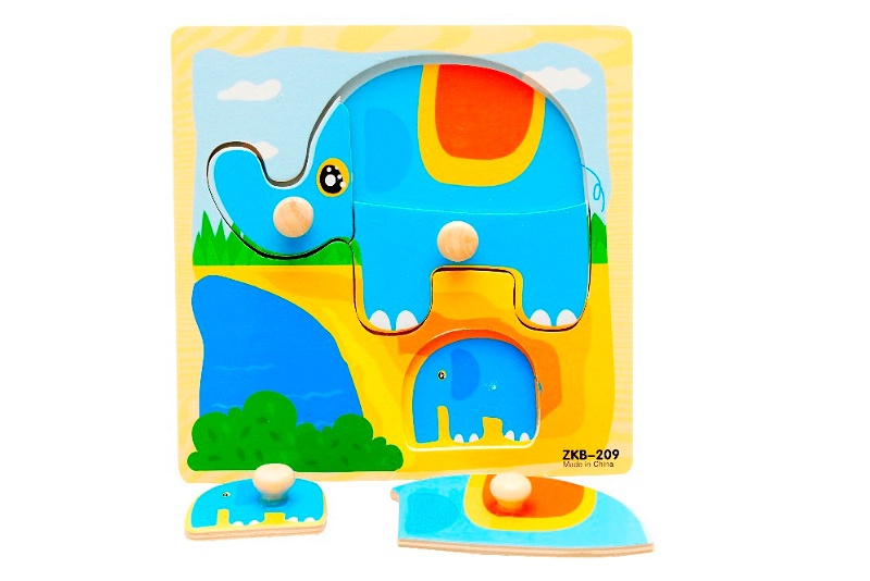 Fiecare puzzle are o forma patrata si contine cateva piese de usor de potrivit. Piesele au maner gros din lemn.