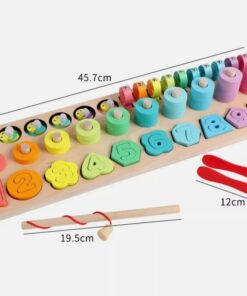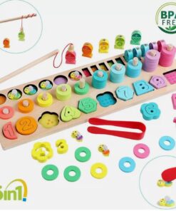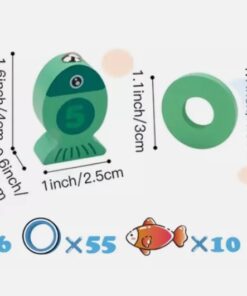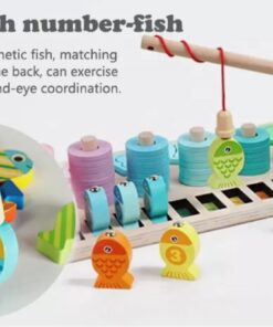 Peștișorii colorați, numerotați și magnetici pot fi „pescuiți” cu undița inclusă – o activitate care dezvoltă răbdarea și coordonarea ochi-mână.