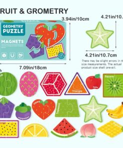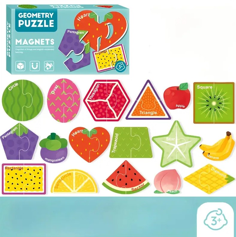 Setul include 30 de piese magnetice colorate, reprezentând forme geometrice de bază (cerc, pătrat, triunghi, dreptunghi, pentagon, hexagon, trapez, inimă, stea) și fructe atractive (măr, banană, pepene, portocală, piersică, căpșună, kiwi, mangostan). Fiecare piesă este imprimată clar, cu culori vii și margini netede, sigure pentru cei mici.