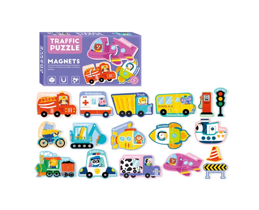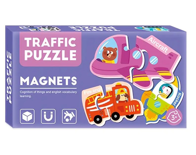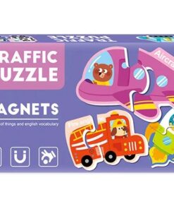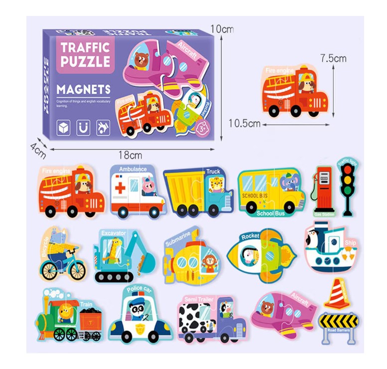 Copiii pot lipi piesele magnetice pe frigider, tablă magnetică sau alte suprafețe metalice, creând scene de trafic sau povești proprii. Fiecare vehicul este format din mai multe piese ce trebuie îmbinate corect, transformând jocul într-un puzzle educativ și interactiv.