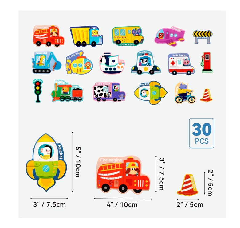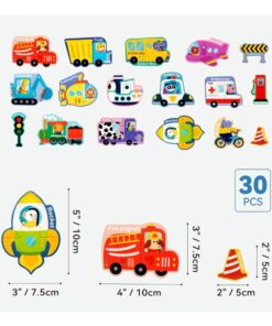 Conținut: 30 de piese magnetice cu vehicule variate (mașină de pompieri, ambulanță, autobuz școlar, tren, avion, navă, excavator, rachetă, semne de circulație etc.).