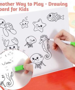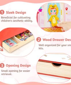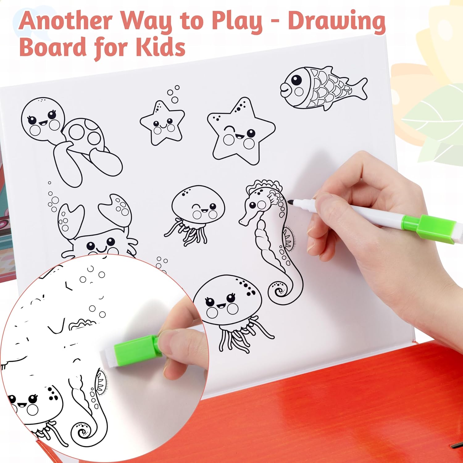 Copilul poate alege să reproducă ținutele de pe cardurile incluse sau să creeze propriile combinații de haine și accesorii, explorând liber diferite variante. Tabla magnetică se poate folosi și ca suport pentru desen, oferind posibilitatea de a completa povești vizuale cu markerul inclus. Jocul permite activități independente, dar este la fel de valoros și în sesiunile de joacă împreună cu părinții, stimulând interacțiunea și exprimarea liberă.