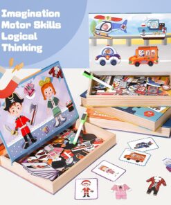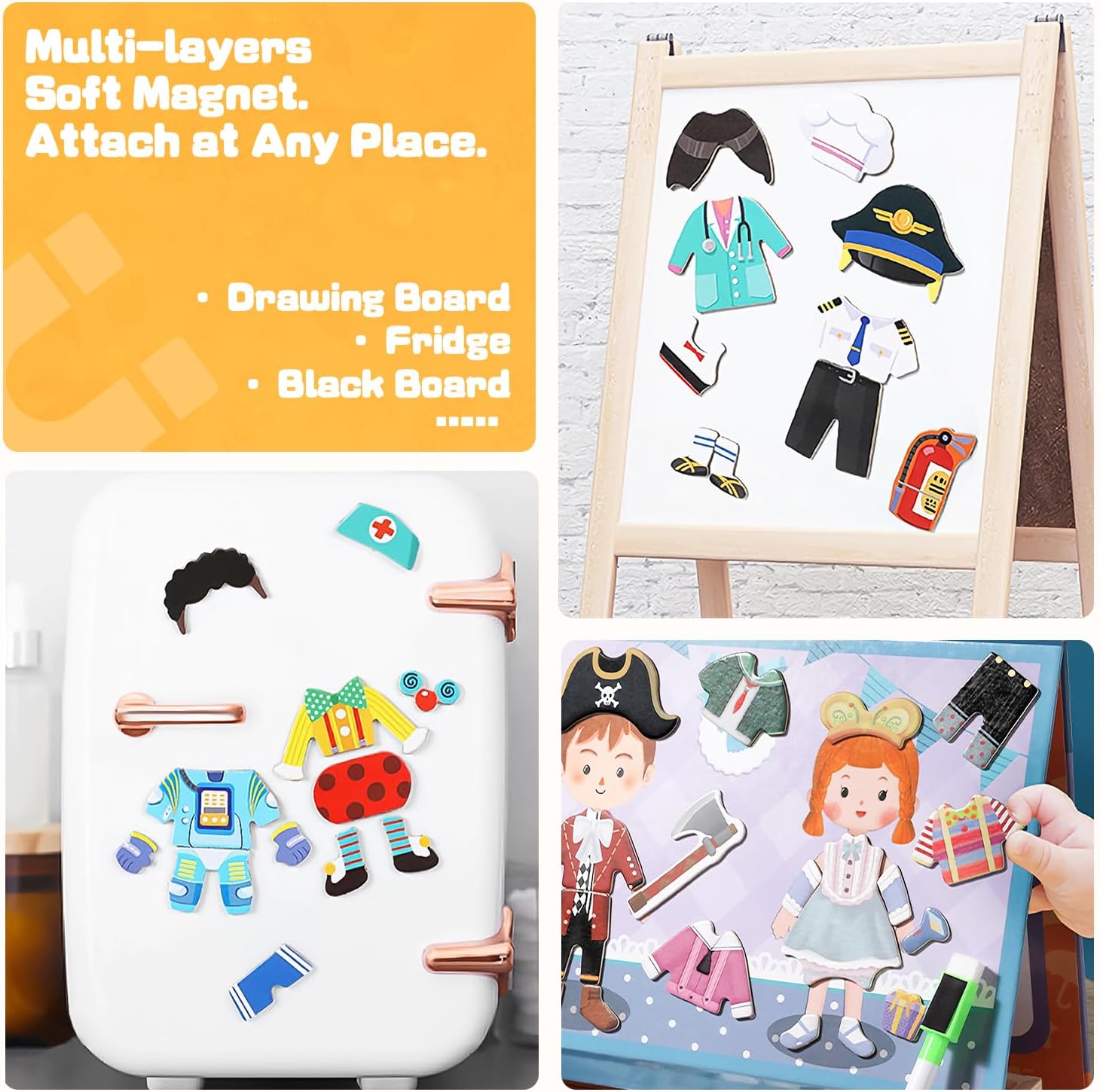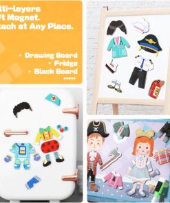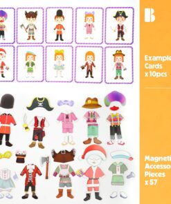 Copilul poate urma modelele de pe cardurile incluse, potrivind hainele și accesoriile corespunzătoare, sau poate explora liber, inventând combinații noi de personaje și povești. Tabla magnetică se poate folosi și pentru desen, completând jocul cu activități creative. Setul este ușor de transportat și se potrivește atât pentru joaca individuală, cât și pentru activități de familie.