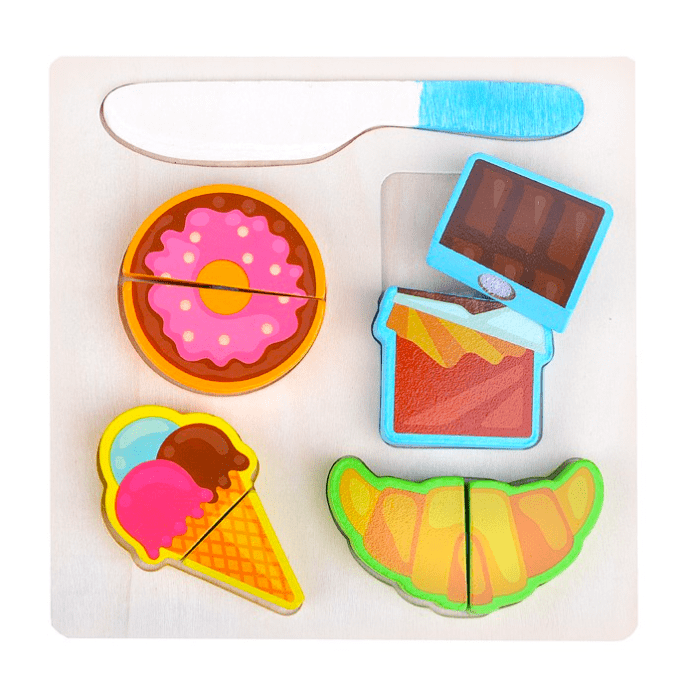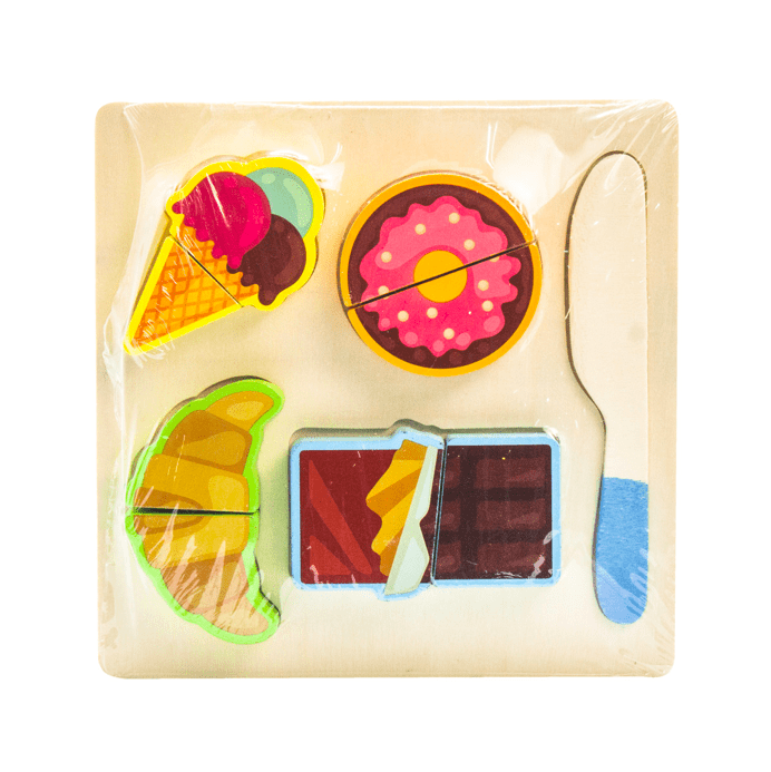 Puzzle din lemn cu prajituri, cu arici, viu colorate.