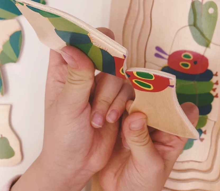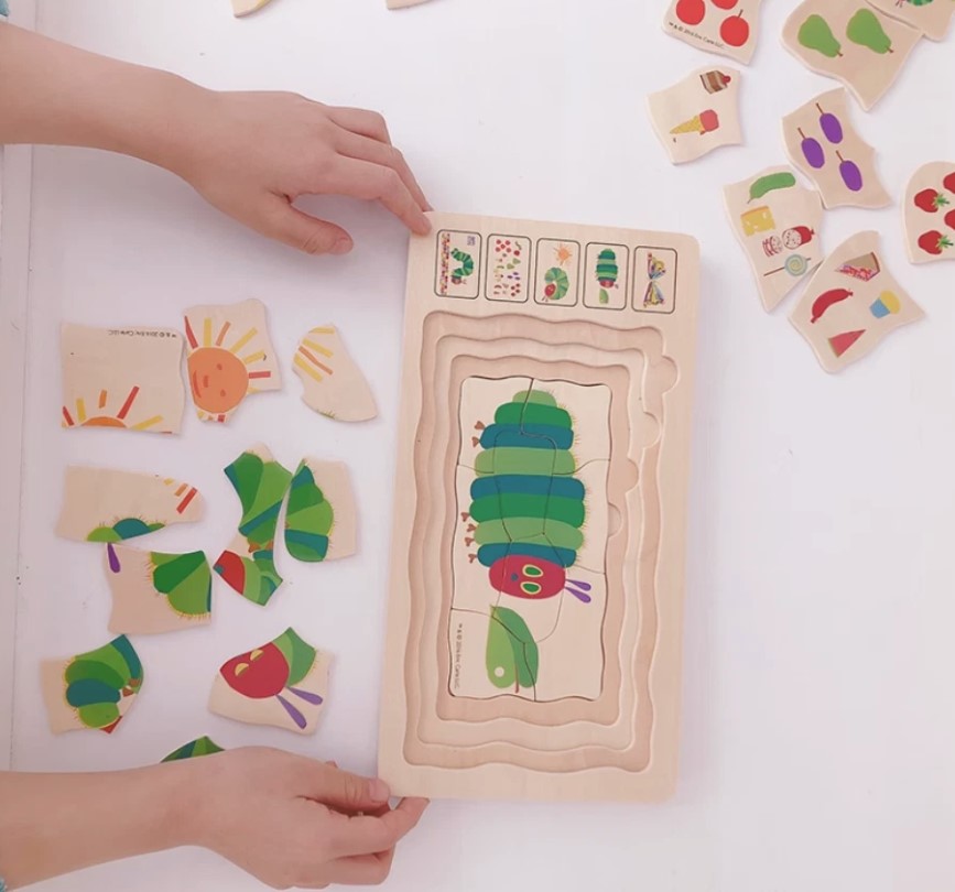Copilul rezolvă puzzle-ul strat cu strat, începând cu oul și terminând cu fluturele adult, înțelegând astfel transformarea biologică în pași concreți și ușor de memorat. Fiecare nivel este conceput să se potrivească perfect în baza de lemn, ghidând copilul intuitiv prin procesul de învățare.