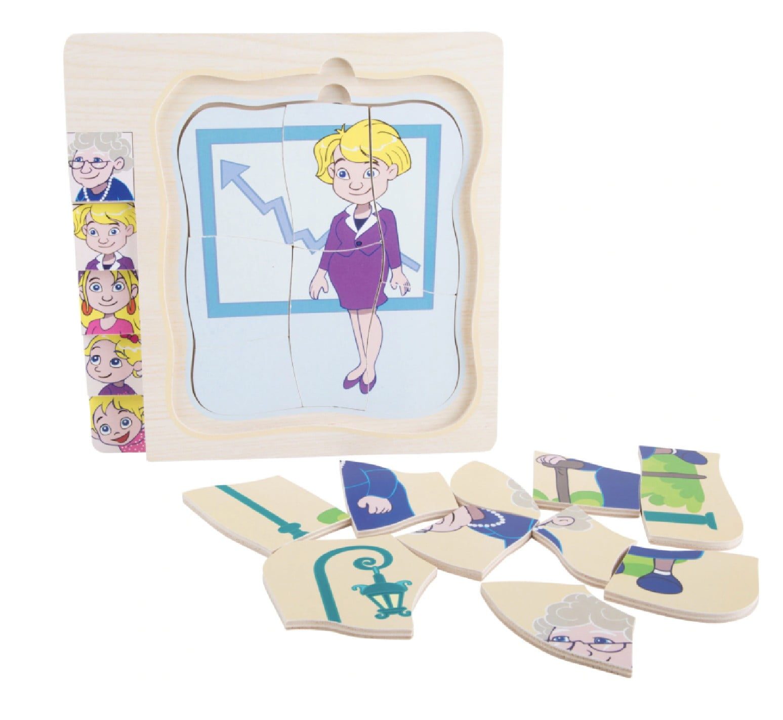 Piesele individuale de puzzle pot fi potrivite pentru a forma imaginea corecta de la stadiul de bebelus pana la acela de bunica.
