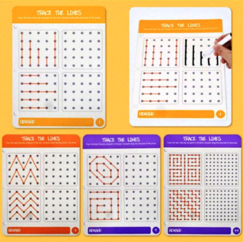 Descoperă un instrument educativ indispensabil pentru dezvoltarea abilităților de scris și control motor fin! Acest set de sabloane reutilizabile pentru grafiere este ideal pentru copiii de la 3 ani, oferind o modalitate distractivă și interactivă de a exersa scrisul și de a-și coordona mișcările mâinilor.
