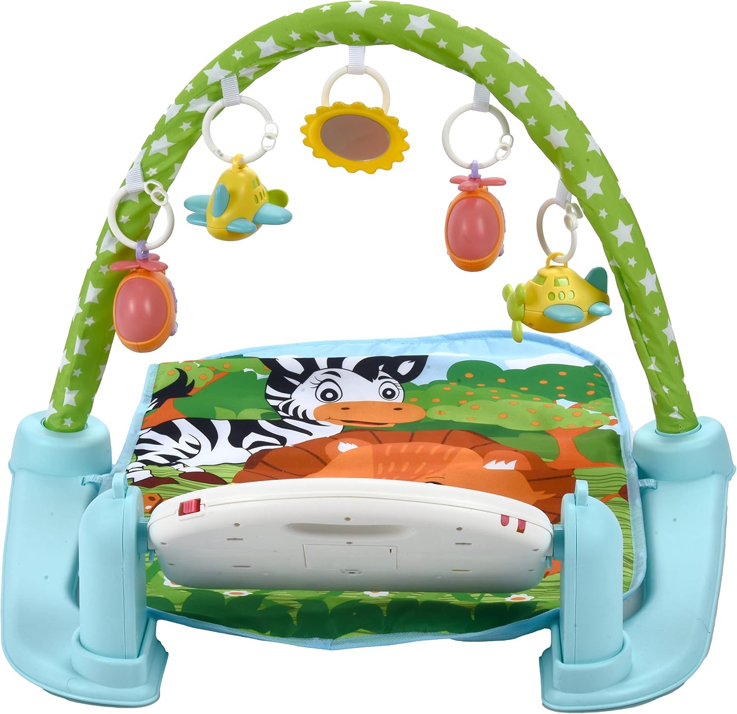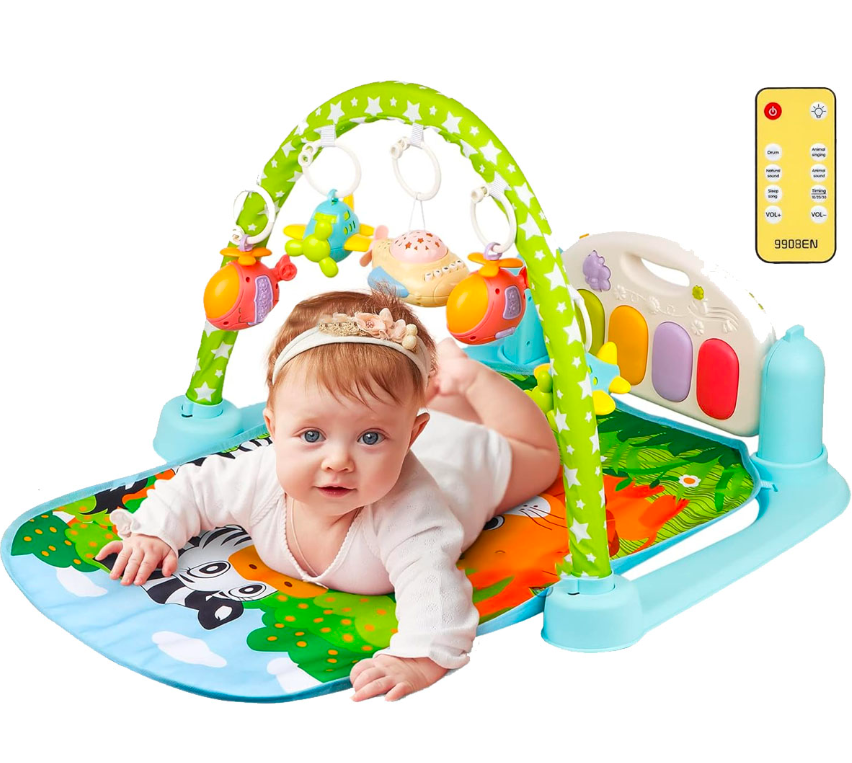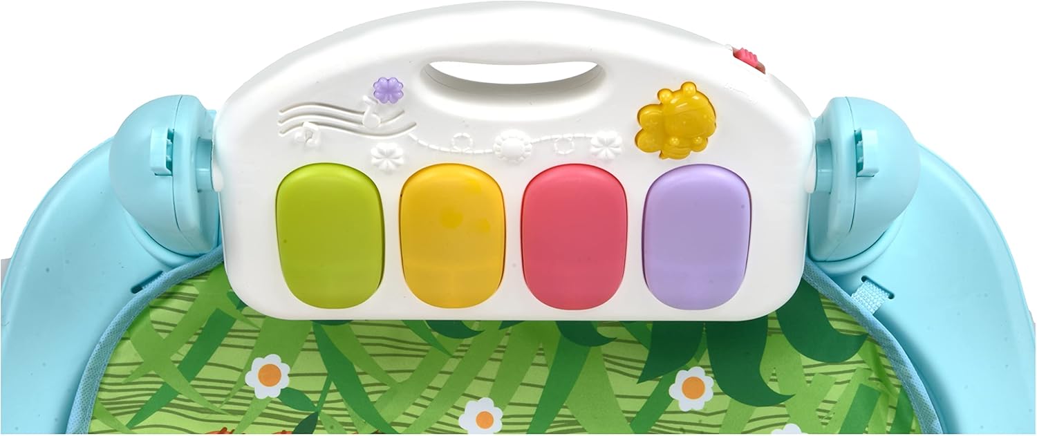 - Pian interactiv: Pianul poate fi utilizat în mai multe moduri, activând muzica atunci când bebelușul lovește cu picioarele sau apasă butoanele mari și colorate.