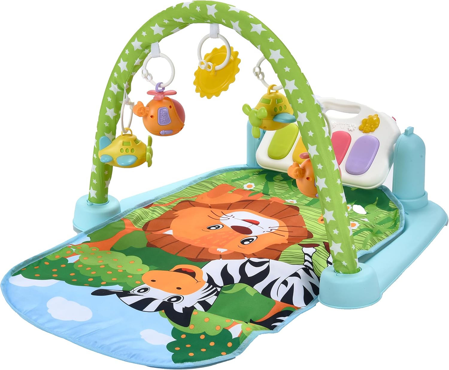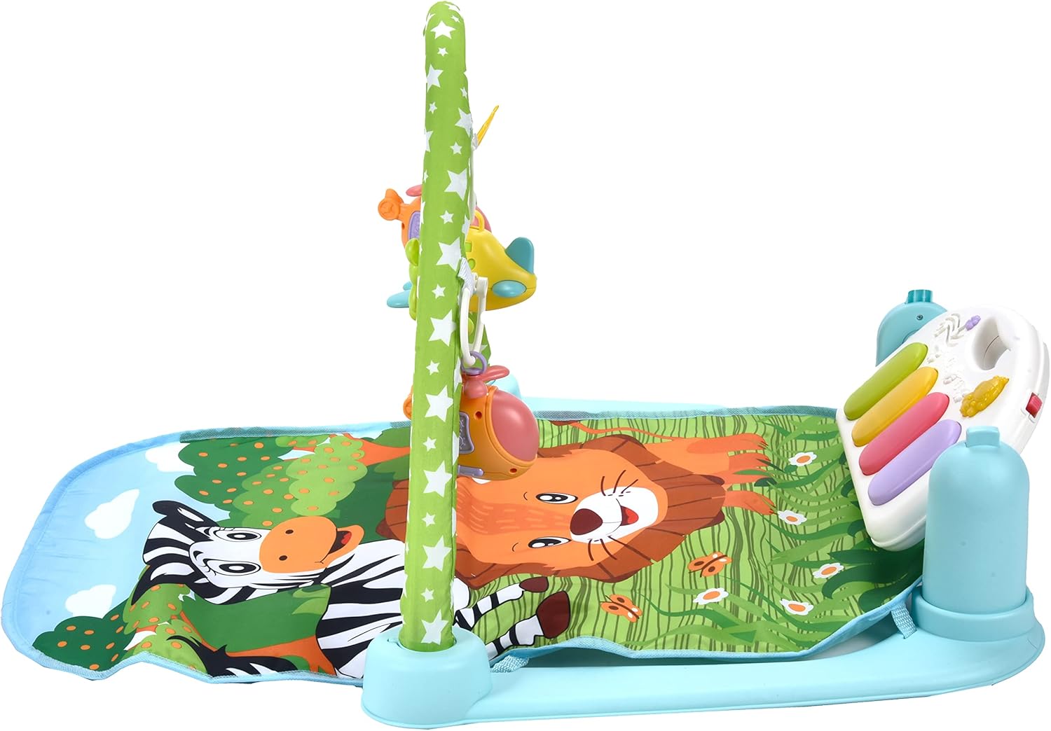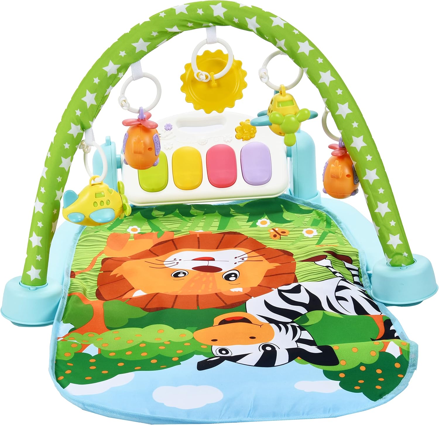 - Pian interactiv: Pianul poate fi utilizat în mai multe moduri, activând muzica atunci când bebelușul lovește cu picioarele sau apasă butoanele mari și colorate.