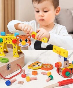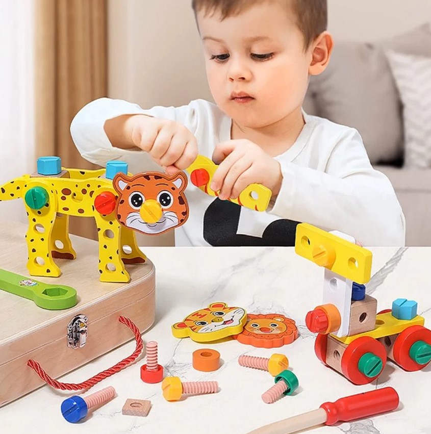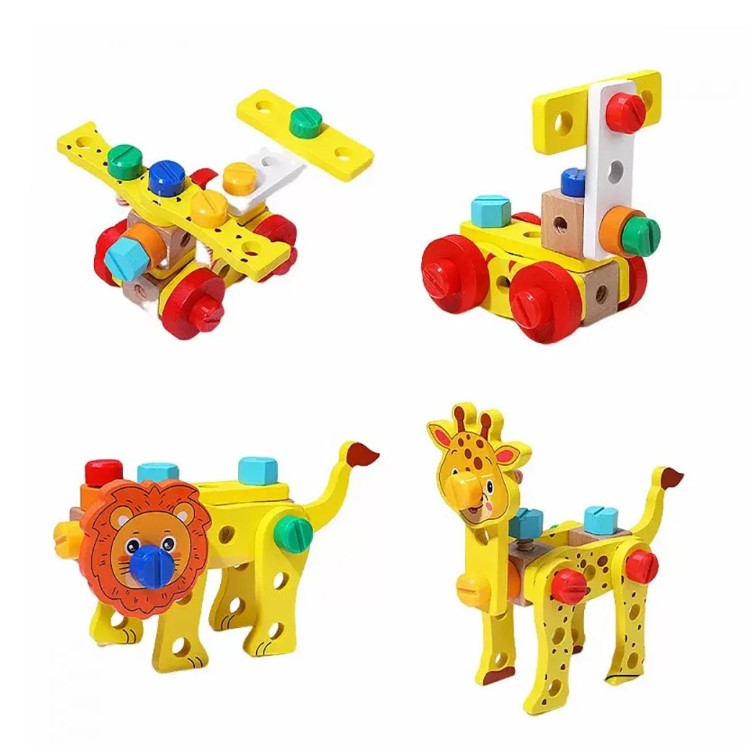 - Piese de asamblare: Suruburi, piulițe și elemente din lemn pentru crearea unor animale simpatice și alte modele.
