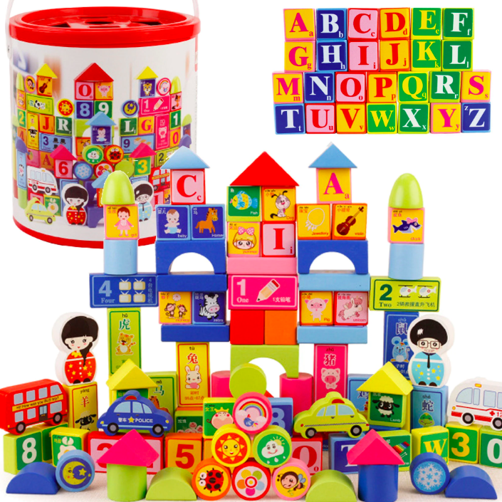 Acest set contine 100 de blocuri din lemn, colorate , ambalate într-un saculet pentru pastrare si o galetusa utila pentru depozitare, care are un capac ce poate fi folosit la sortatea diferitelor forme geometrice continute in set.