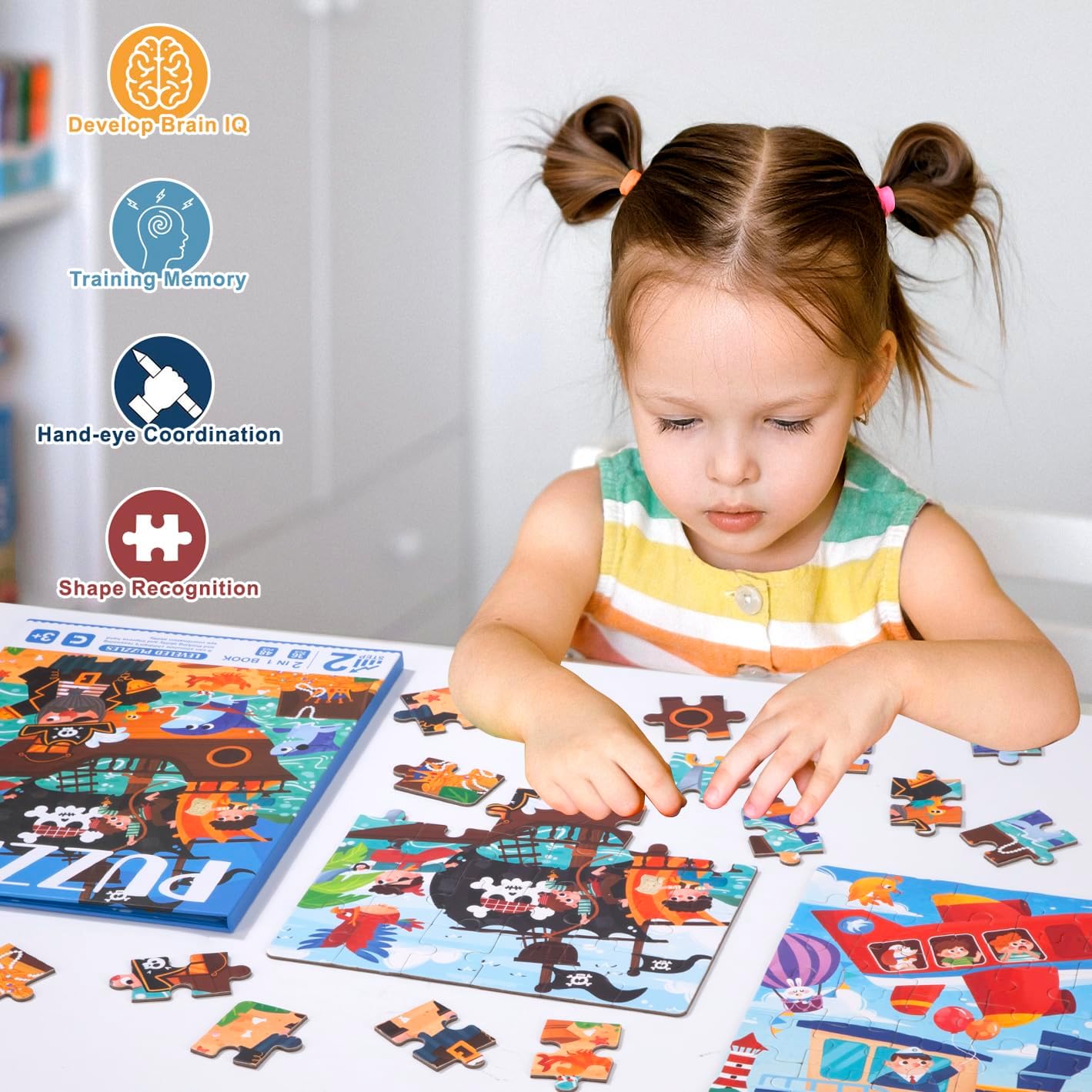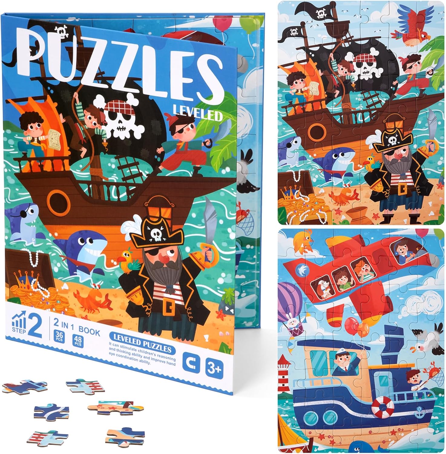 Acest set conține 2 puzzle-uri magnetice cu tematică pirați, ideale pentru copiii pasionați de aventuri pe mare. Piesele colorate și ilustrate cu detalii atractive îi ajută pe cei mici să își dezvolte abilitățile de gândire logică și coordonare. Puzzle-urile sunt integrate într-o carte practică, ceea ce le face ușor de depozitat și perfecte pentru călătorii.