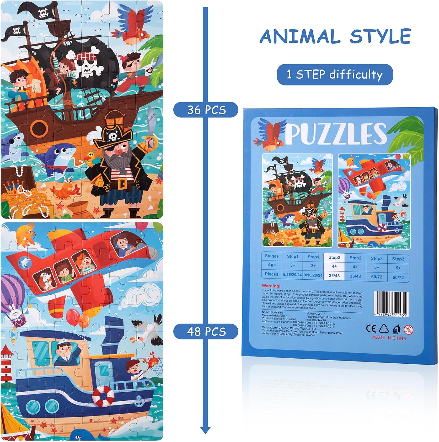 Număr piese: 2 puzzle-uri – unul cu 36 piese și unul cu 48 piese.