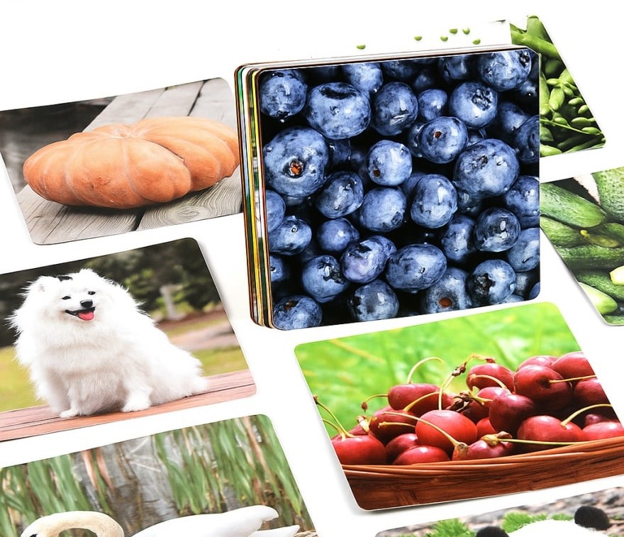 Conținut: 20 carduri cu imagini color (animale, fructe, legume, vehicule etc.)