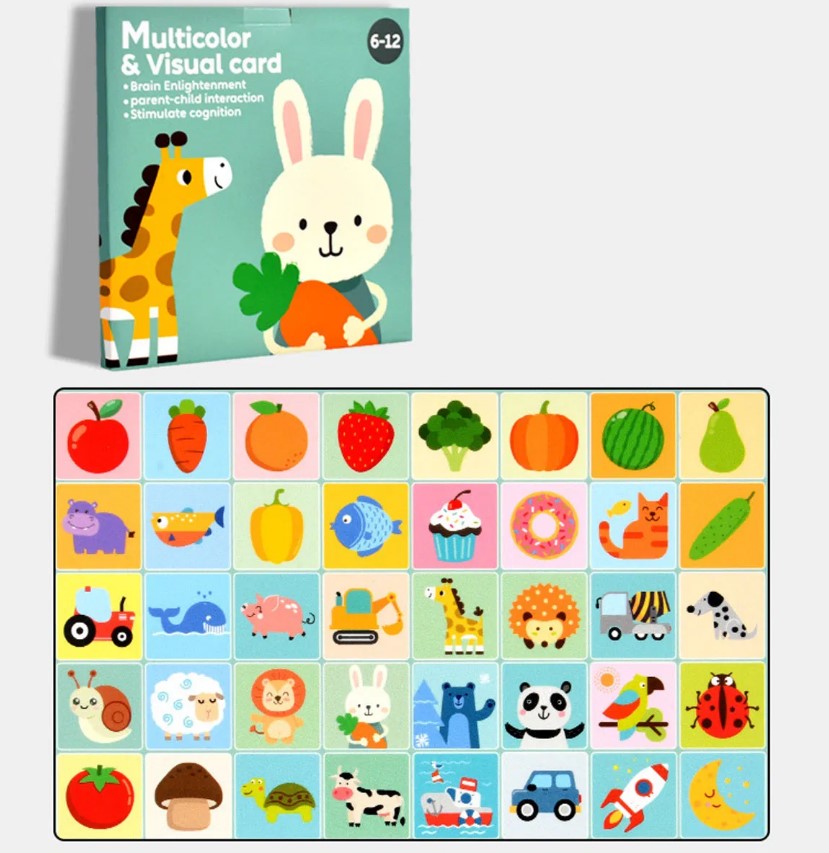 Setul de 20 carduri educative pentru stimulare cognitivă și vizuală este special creat pentru bebelușii între 6 și 12 luni, în etapa în care vederea și atenția vizuală se dezvoltă rapid. Cardurile au ilustrații colorate, mari și clare, cu animale, fructe, legume, obiecte și vehicule, concepute să atragă privirea celor mici și să stimuleze recunoașterea vizuală.