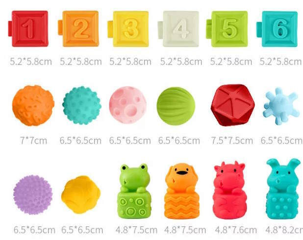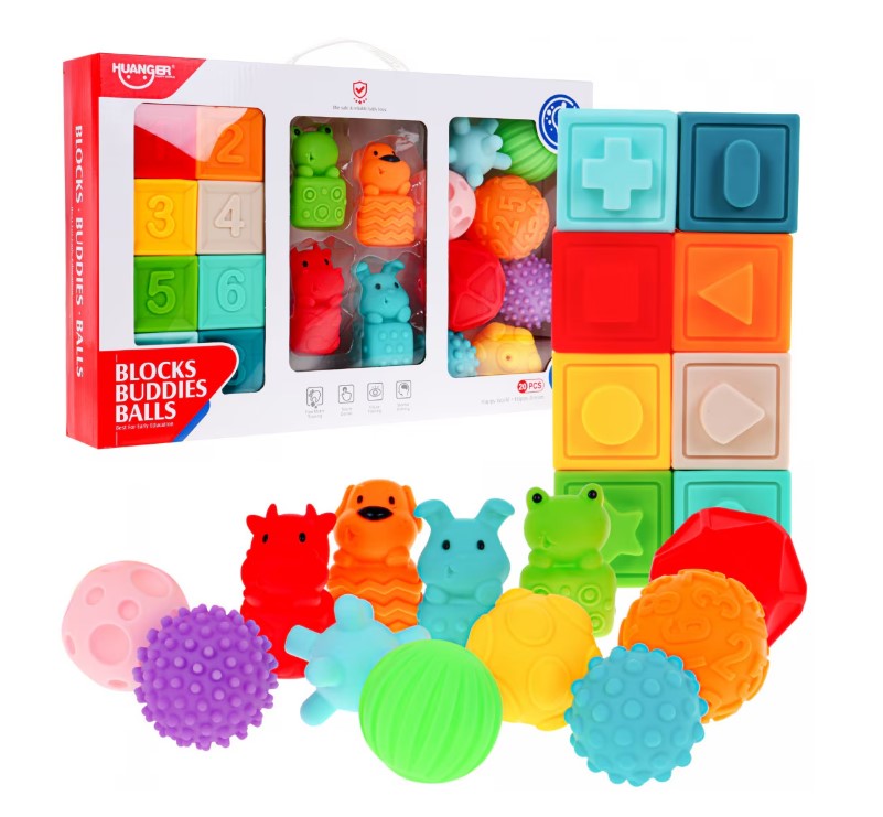 Setul de 20 cuburi și mingi senzoriale din silicon moale este o jucărie educativă destinată bebelușilor de la 6 luni+, concepută pentru stimularea tactilă, dezvoltarea coordonării și explorarea senzorială timpurie. Texturile variate, culorile vibrante și formele diferite contribuie la dezvoltarea cognitivă și motrică încă din primele etape de viață.