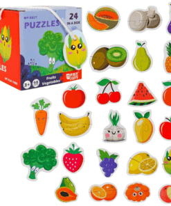 - Fiecare puzzle cu fructe sau legume este alcatuit din 2 piese, care se potrivesc usor si au dimensiuni potrivite pentru manutele celor mici.