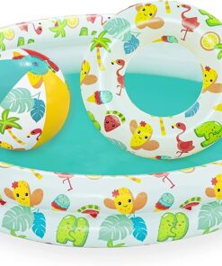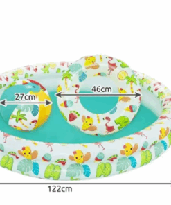 SET 3in1 – piscina gonflabila inclusa pentru copii cu dimensiunile 122cm x 20cm. În plus, vine cu două jucării gonflabile. Mingea gonflabilă cu diametrul de 27 cm este potrivită pentru utilizare atât în apă, cât și pe sol. Pentru ca micul înotător începător să se împrietenească mai repede cu apa, setul include și un colac cu diametrul de 46 cm. Toate elementele cu o temă marină minunată.