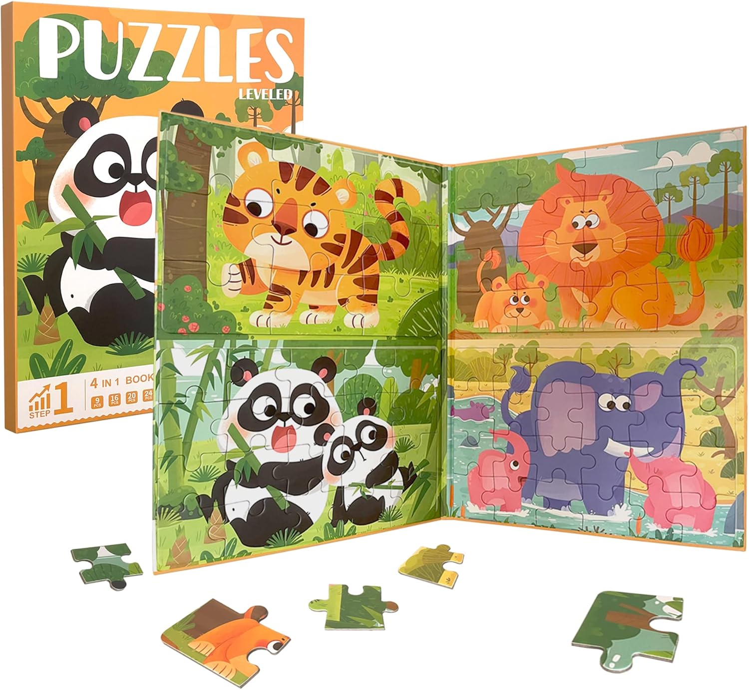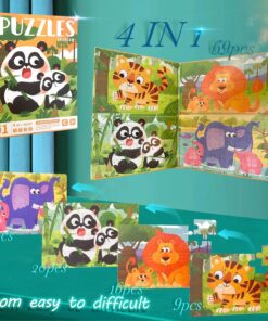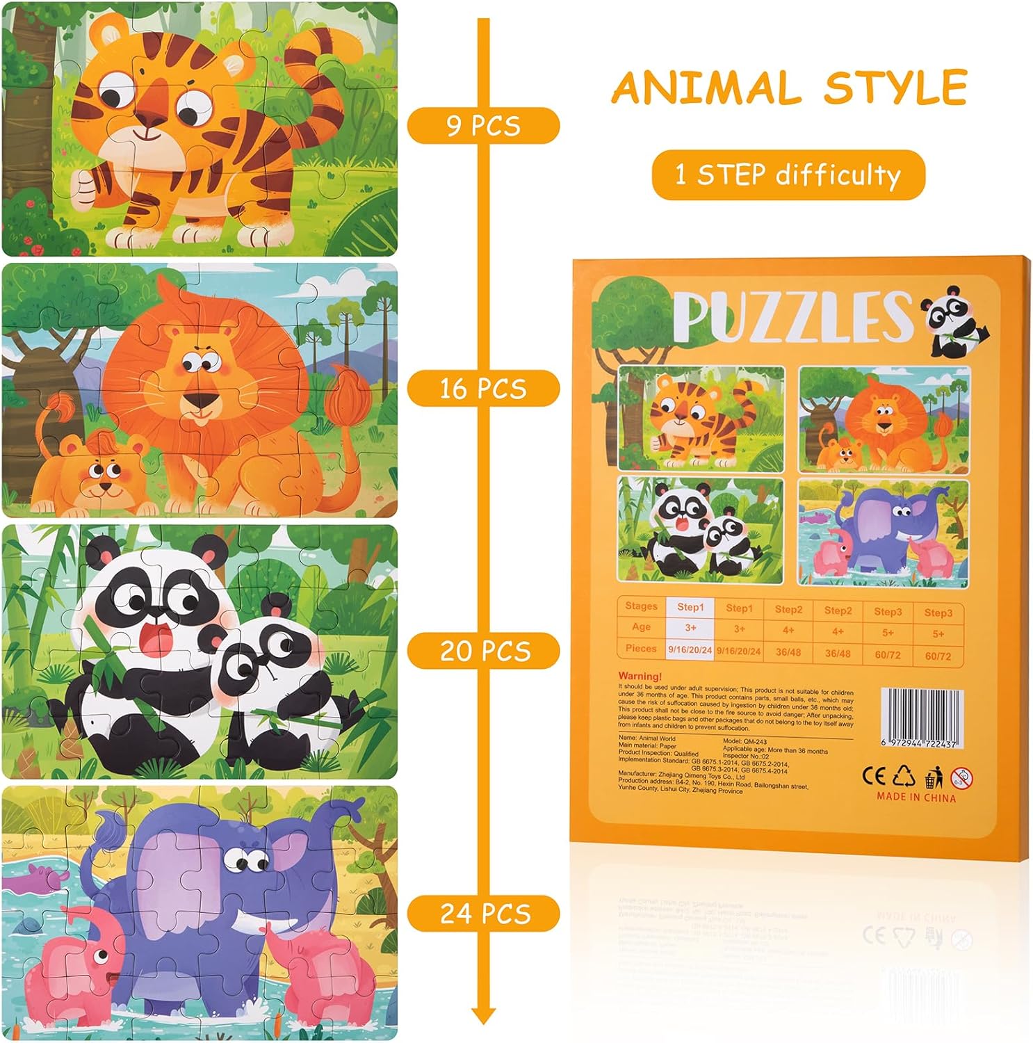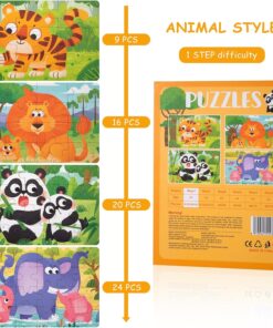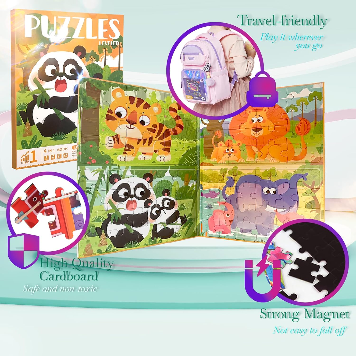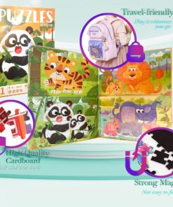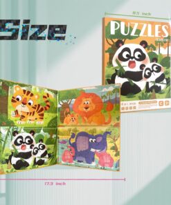 Setul conține 4 puzzle-uri magnetice cu tematică animale sălbatice, ideale pentru copiii de la 3 ani în sus. Fiecare puzzle are un număr diferit de piese (9, 16, 20 și 24), ceea ce îi ajută pe cei mici să progreseze treptat de la modele simple la modele mai complexe. Piesele sunt colorate, sigure și realizate din lemn rezistent cu margini netede, prevăzute cu strat magnetic pentru o fixare stabilă.